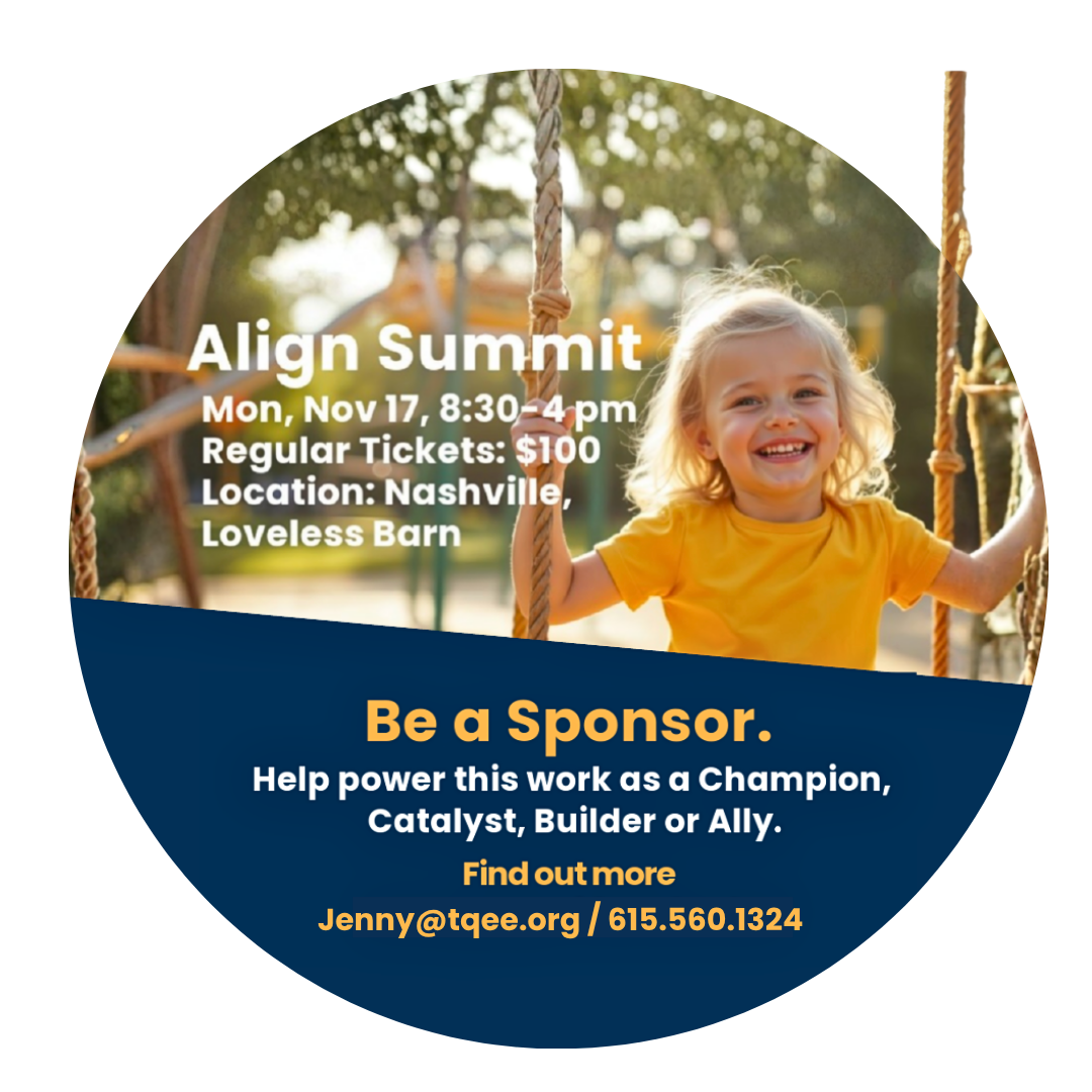 TQEE invites you to join us for the Align Early Childhood & Family Policy Summit on Monday, November 17 in Nashville, 8:30-4pm, at the Loveless Barn. Featuring nationally recognized speakers and state experts, the event will bring together leaders from across the state — early childhood advocates and practitioners, business and civic leaders, and policymakers — to chart the course for how Tennessee can ensure our youngest children and their families thrive.